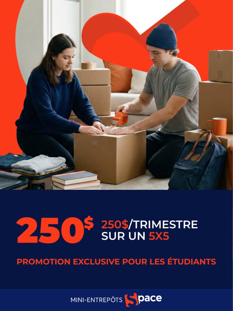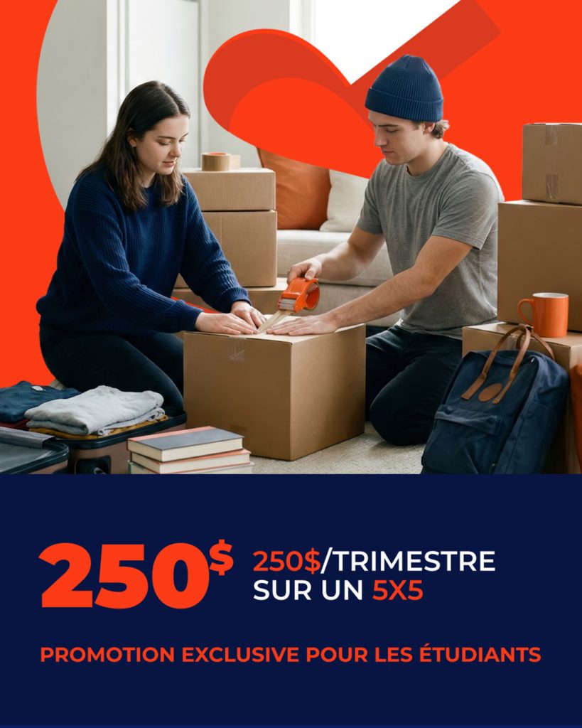 Valide pour nos unités 5×5 uniquement. En succursale seulement, sur présentation de la carte étudiante. (Prix tout inclus : assurances et frais d’ouverture de dossier. Payé en un seul versement. Session = 16 semaines)